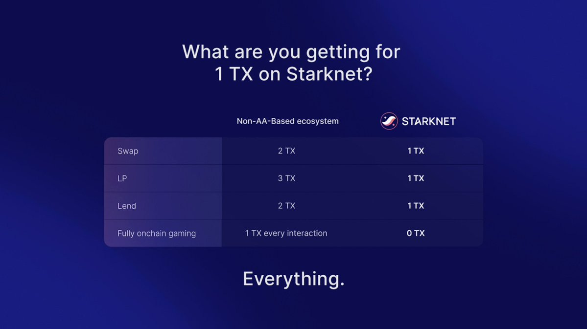 1-tx for everything: No need to execute 3 transactions to LP on an AMM, 2 to lend, or 2 to swap. Just one transaction is enough to do everything on Starknet.